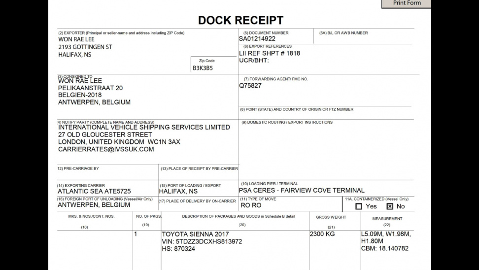 이 서류는 Halifax 항구의 서류처리를 위한 것이고, 항만당국에 제출하면 ACL 직원들이 나와서 서류와 차량을 대조하는 정식 항만공사에 차량을 인도한다는 서류이다.