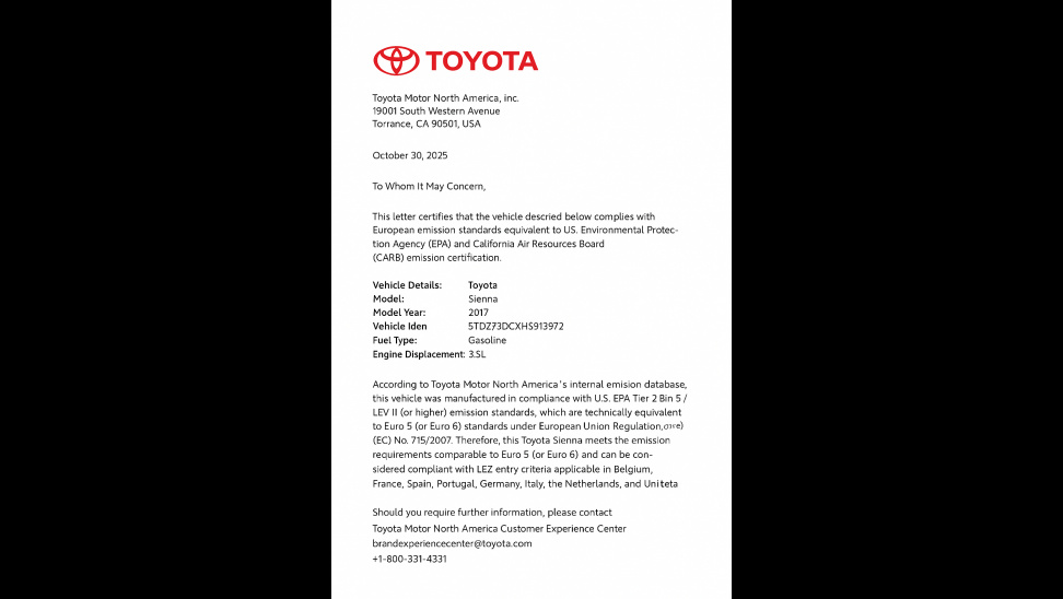 • LEZ Conformity Letter for Toyota Sienna