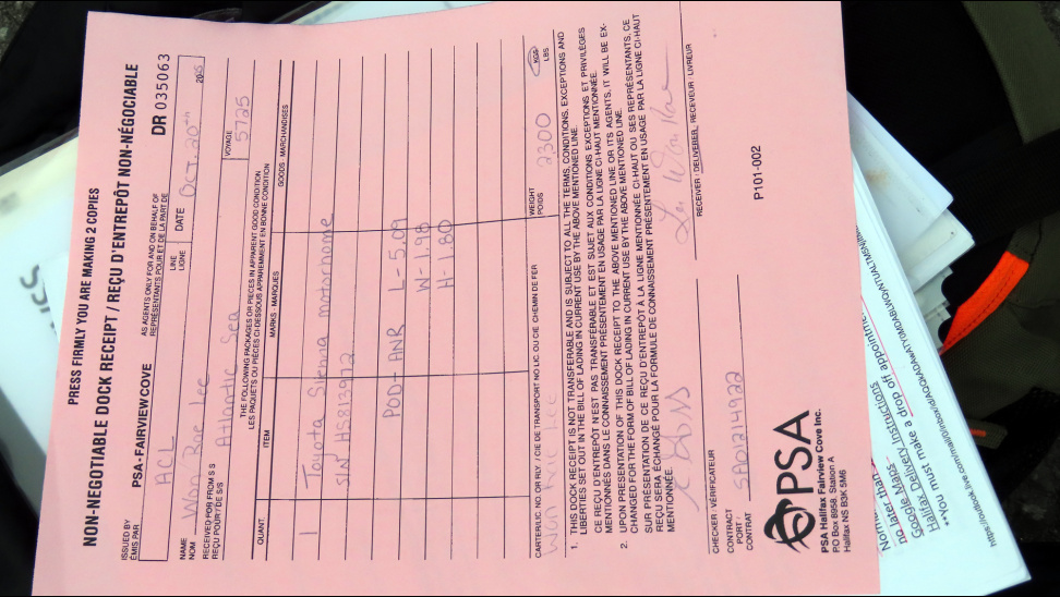 이 서류는 Halifax 항구의 서류처리를 위한 것이고, 항만당국에 제출하면 ACL 직원들이 나와서 서류와 차량을 대조하는 정식 항만공사에 차량을 인도한다는 서류이다.